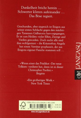 Geschunden, aber siegreich ist Eragon aus seiner ersten Schlacht gegen den mächtigen Tyrannen Galbatorix hervorgegangen. Er ist zum Helden vieler Elfen, Zwerge und Varden geworden, doch nicht alle sind ihm wohlgesinnt. Die Kräuterfrau Angela hat einen Verräter prophezeit, der aus Eragons eigener Familie stammen soll. Eragon ist sich sicher: Der einzig lebende Verwandte ist sein Cousin Roran - aber niemals würde dieser sich gegen ihn wenden! Doch die Prophezeiung spricht: "So wird es kommen, selbst wenn du es zu verhindern suchst."