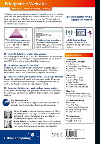 Alles, was Sie für Ihren erfolgreichen Webauftritt benötigen. Zahlreiche Praxisbeispiele zeigen Ihnen anschaulich den Weg zu einer besseren Webpräsenz und beantwortet Ihre Fragen: Wie nutze ich alle Marketing-Kanäle? Wie verbessere ich die Suchmaschinen-Präsenz meiner Website? Wie gestalte ich die Benutzerführung? Inkl. SEO, SEM, Online-Marketing, Affiliate-Programme, Google AdWords, Web Analytics, Social Media-, E-Mail-, Newsletter- und Video-Marketing, Mobiles Marketing u.v.m.