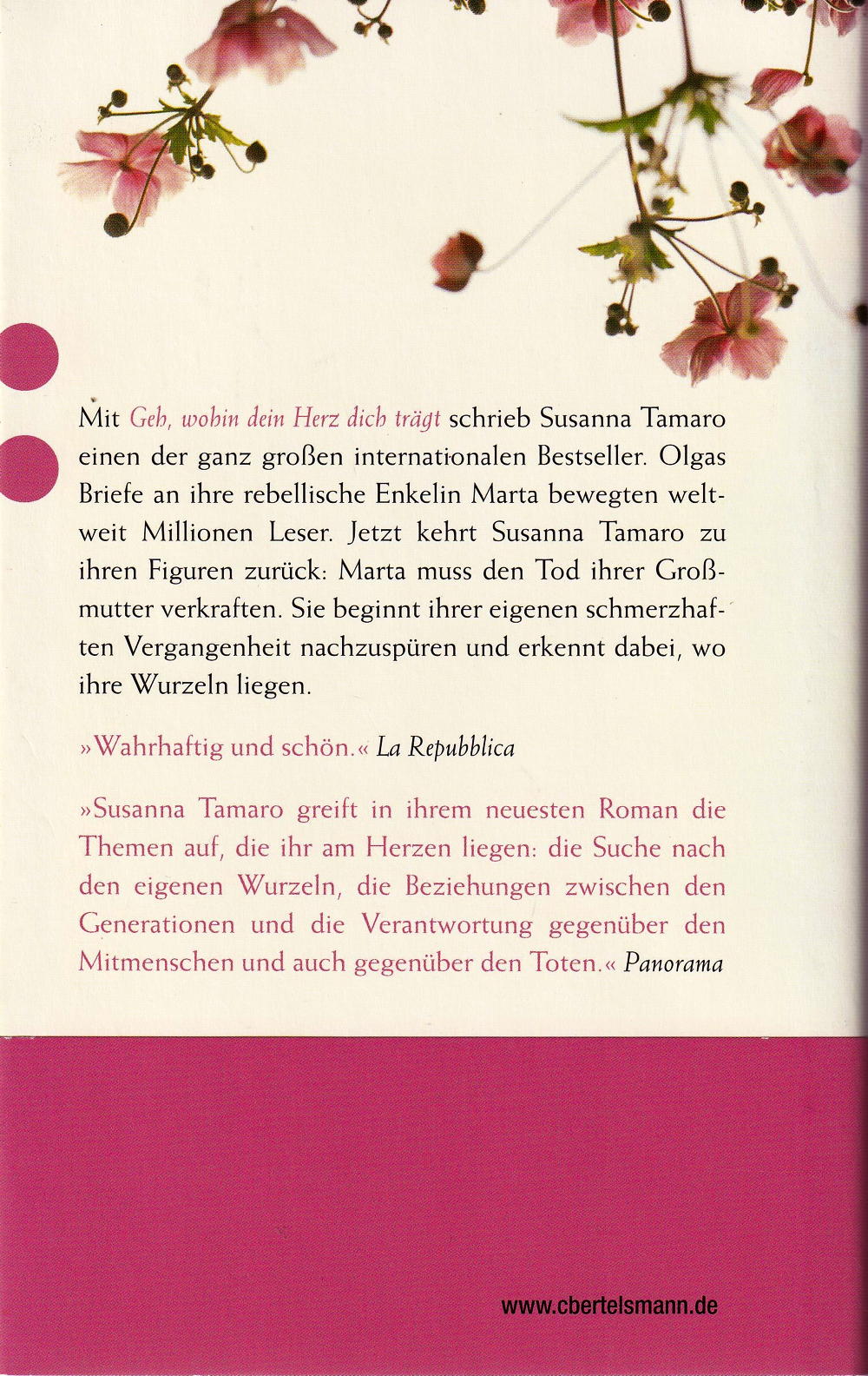Mit ihrem neuesten Roman kehrt Susanna Tamaro zu den Figuren von "Geh, wohin dein Herz dich trägt" zurück: Nach Jahren der Trennung kommt Marta, Olgas rebellische Enkelin, aus Amerika heim. Doch für eine Aussöhnung ist es zu spät. Olga ist alt geworden, und sie lebt immer mehr in ihrer eigenen Welt. Als sie eines Tages im Garten zusammenbricht und stirbt, muss sich Marta der Vergangenheit stellen. Sie beginnt, ihrer eigenen Herkunft nachzuspüren und erkennt dabei, wo ihre wahren Wurzeln liegen.