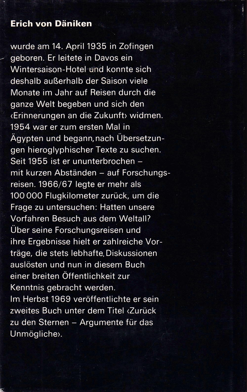 Im Herbst 1969 veröffentlichte er sein zweites Buch unter dem Titel <Zurück zu den Sternen - Argumente für das Unmögliche».