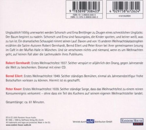 Der Baum beginnt zu nadeln. Schorsch und Erna sind fassungslos, die Kinder spotten, und keiner weiss, was zu tun ist. Ein dramatisches Schauspiel nimmt seinen Lauf. Davon und von 15 anderen Weihnachtskatastrophen erzählen die Satire-Autoren Robert Gernhardt, Bernd Eilert und Peter Knorr bei ihrer gemeinsamen Lesung im Café in der Muffat-Halle in München. Und sie verschonen nichts und niemand, wenn es um Weihnachten geht, auf keinen Fall aber die Lachmuskeln ihres Publikums.