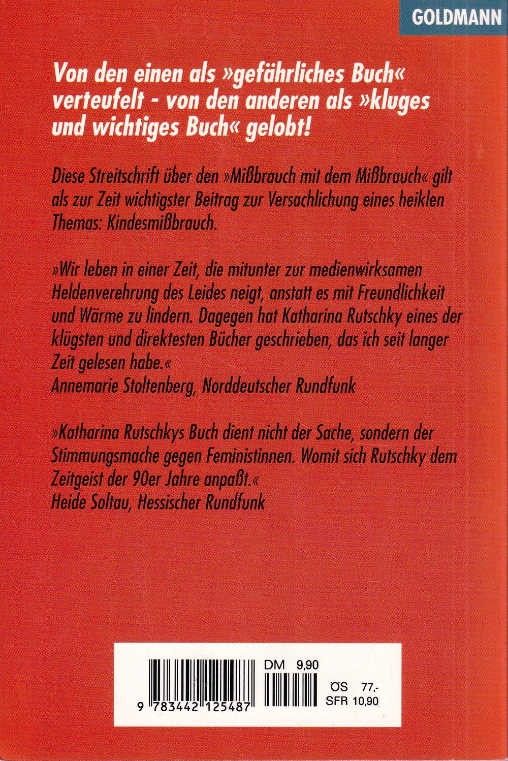 Katharina Rutschky (1941 - 2010 in Berlin), war eine der bekanntesten deutschen Nachkriegsessayistinnen. Für ihre Untersuchungen zur Schwarzen Pädagogik und ihre Wortmeldungen zur Frauenfrage, Bildungspolitik und Sexualität wurde sie unter anderem mit dem Heinrich-Mann-Preis ausgezeichnet.