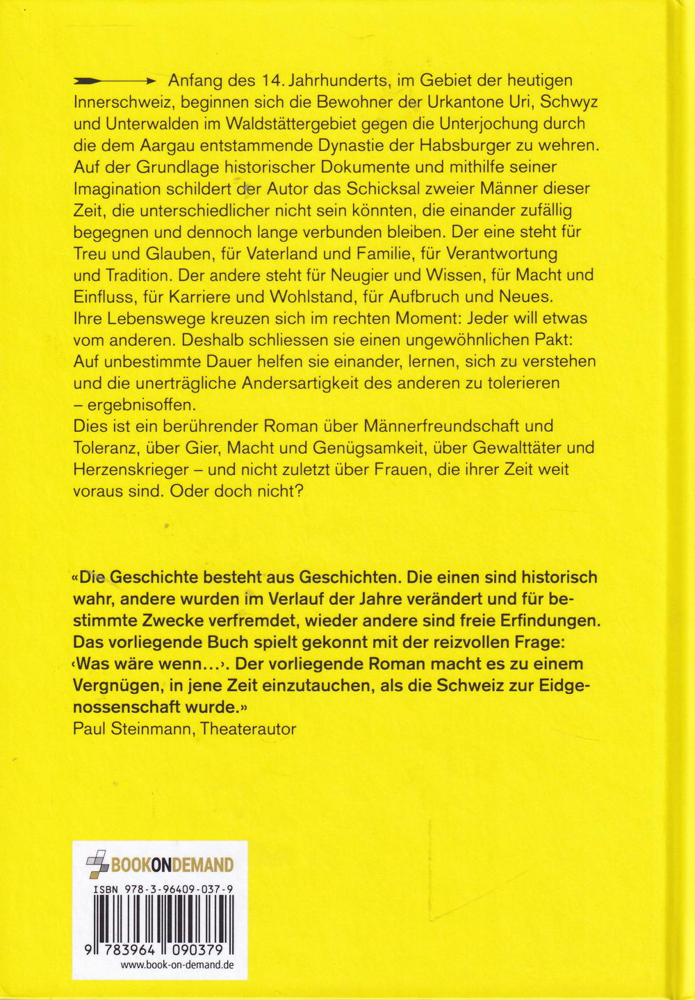 Anfang des 14. Jahrhunderts, im Gebiet der heutigen Innerschweiz, beginnen sich die Bewohner der Urkantone Uri, Schwyz und Unterwalden im Waldstättergebiet gegen die Unterjochung durch die dem Aargau entstammende Dynastie der Habsburger zu wehren. Auf der Grundlage historischer Dokumente und mithilfe seiner Imagination schildert der Autor das Schicksal zweier Männer dieser Zeit, die unterschiedlicher nicht sein könnten, die einander zufällig begegnen und dennoch lange verbunden bleiben. Der eine steht für Treu und Glauben, für Vaterland und Familie, für Verantwortung und Tradition. Der andere steht für Neugier und Wissen, für Macht und Einfluss, für Karriere und Wohlstand, für Aufbruch und Neues. Ihre Lebenswege kreuzen sich im rechten Moment: Jeder will etwas vom anderen. Deshalb schliessen sie einen ungewöhnlichen Pakt: Auf unbestimmte Dauer helfen sie einander, lernen, sich zu verstehen und die unerträgliche Andersartigkeit des anderen zu tolerieren - ergebnisoffen. Dies ist ein berührender Roman über Männerfreundschaft und Toleranz, über Gier, Macht und Genügsamkeit, über Gewalttäter und Herzenskrieger - und nicht zuletzt über Frauen, die ihrer Zeit weit voraus sind. Oder doch nicht? - "Die Geschichte besteht aus Geschichten. Die einen sind historisch wahr, andere wurden im Verlauf der Jahre verändert und für bestimmte Zwecke verfremdet, wieder andere sind freie Erfindungen. Das vorliegende Buch spielt gekonnt mit der reizvollen Frage: 'Was wäre wenn...'.