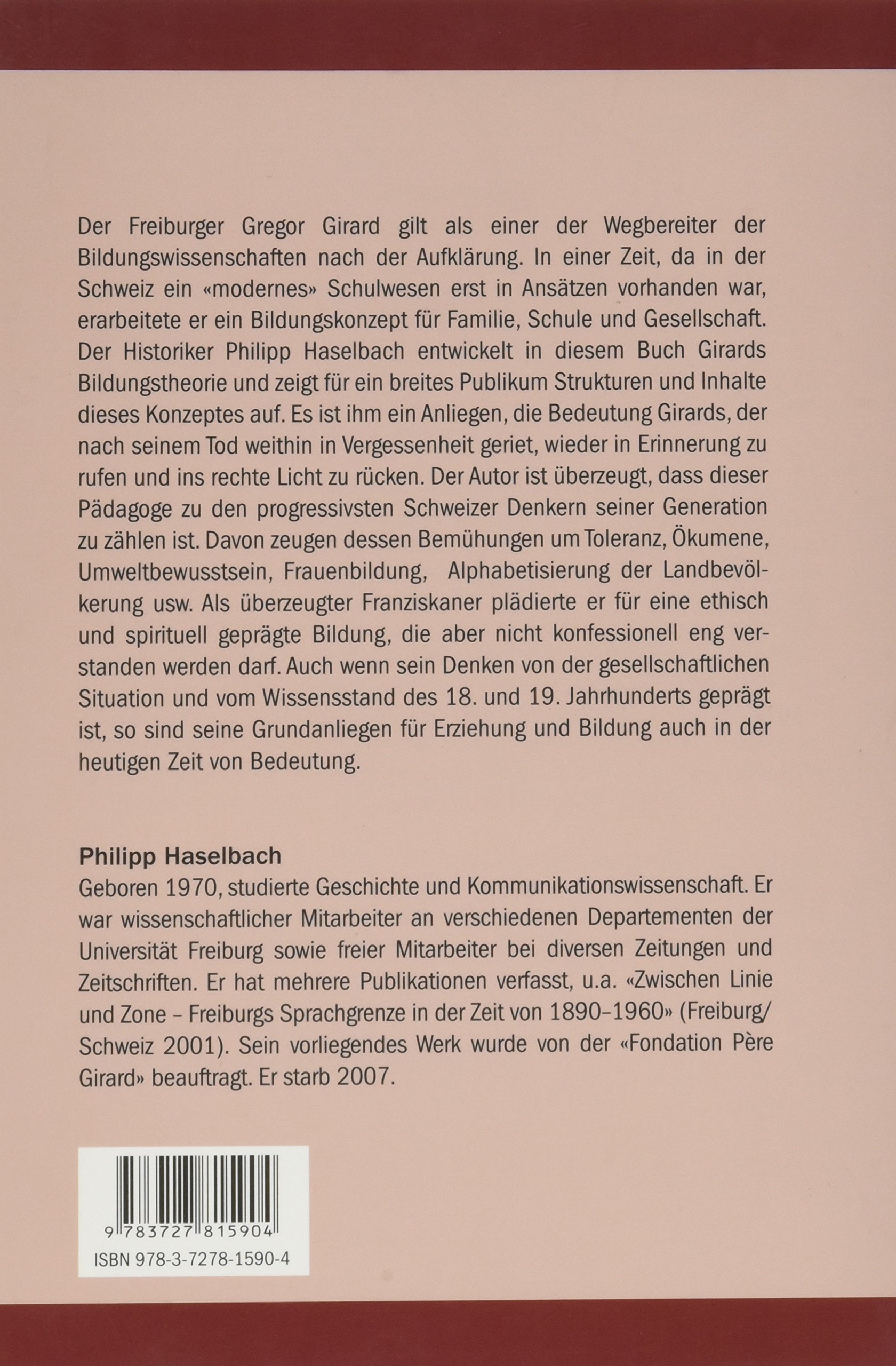 Der Historiker Philipp Haselbach entwickelt in diesem Buch Girards Bildungstheorie und zeigt für ein breites Publikum Strukturen und Inhalte dieses Konzeptes auf. Es ist ihm ein Anliegen, die Bedeutung Girards, der nach seinem Tod weithin in Vergessenheit geriet, wieder in Erinnerung zu rufen und ins rechte Licht zu rücken. Der Autor ist überzeugt, dass dieser Pädagoge zu den progressivsten Schweizer Denkern seiner Generation zu zählen ist. Davon zeugen dessen Bemühungen um Toleranz, Ökumene, Umweltbewusstsein, Frauenbildung, Alphabetisierung der Landbevölkerung usw. Als überzeugter Franziskaner plädierte er für eine ethisch und spirituell geprägte Bildung, die aber nicht konfessionell eng verstanden werden darf. Auch wenn sein Denken von der gesellschaftlichen Situation und vom Wissensstand des 18. Und 19. Jahrhunderts geprägt ist, so sind seine Grundanliegen für Erziehung und Bildung auch in der heutigen Zeit von Bedeutung.