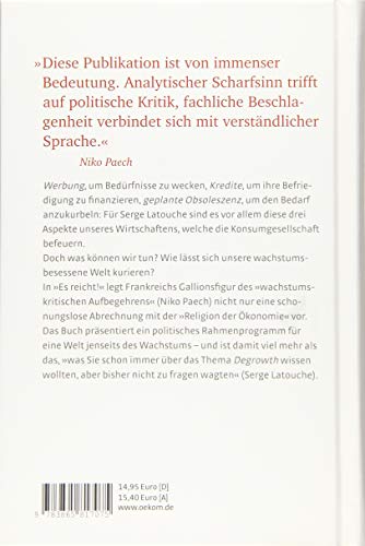 Werbung, um Bedürfnisse zu wecken, Kredite, um ihre Befriedigung zu finanzieren, geplante Obsoleszenz, um den Bedarf anzukurbeln: Für Serge Latouche sind es vor allem diese drei Aspekte unseres Wirtschaftens, welche die Konsumgesellschaft befeuern. Doch was können wir tun? Wie lässt sich unsere wachstumsbesessene Welt kurieren? In »Es reicht!« legt Frankreichs Gallionsfigur des »wachstumskritischen Aufbegehrens« (Niko Paech) nicht nur eine schonungslose Abrechnung mit der »Religion der Ökonomie« vor. Das Buch präsentiert ein politisches Rahmenprogramm für eine Welt jenseits des Wachstums – und ist damit viel mehr als das, »was Sie schon immer über das Thema Degrowth wissen wollten, aber bisher nicht zu fragen wagten« (Serge Latouche).