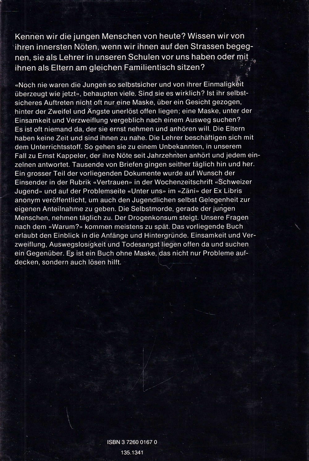 Ein grosser Teil der vorliegenden Dokumente wurde auf Wunsch der Einsender in der Rubrik «Vertrauen» in der Wochenzeitschrift «Schweizer haben keine Zeit und sind ihnen zu nahe. Die Lehrer besc Jugend» und auf der Problemseite «Unter uns» im «Zäni» der Ex Libris anonym veröffentlicht, um auch den Jugendlichen selbst Gelegenheit zur eigenen Anteilnahme zu geben. Die Selbstmorde, gerade der jungen Menschen, nehmen täglich zu. Der Drogenkonsum steigt. Unsere Fragen nach dem «Warum? » kommen meistens zu spät. Das vorliegende Buch erlaubt den Einblick in die Anfänge und Hintergründe. Einsamkeit und Verzweiflung, Auswegslosigkeit und Todesangst liegen offen da und suchen ein Gegenüber. Es ist ein Buch ohne Maske, das nicht nur Probleme aufdecken, sondern auch lösen hilft.