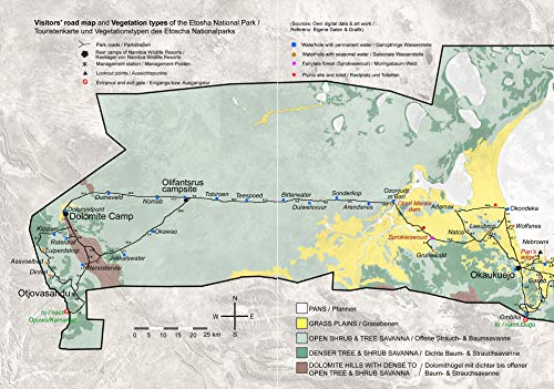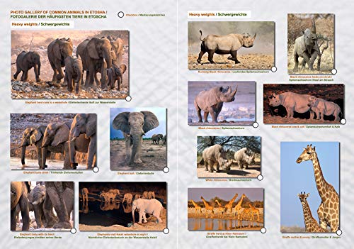 Die ETOSCHA KARTE ist eine detaillierte Karte des Etoscha Nationalparks in Namibia mit exakten Kilometerangaben der Distanzen zwischen Wasserstellen und Rastlagern. Sie zeigt alle wichtigen Details wie Parkeingänge, Rastlager, ganzjährige & saisonale Wasserstellen, Parkstrassen, Vegetationstypen, Rastplätze und Toiletten innerhalb Etoschas für eine genaue Planung und klare Orientierung unterwegs. Die Fotogalerie mit über 180 Farbfotos der häufigsten Säugetiere, Vögel etc. ermöglicht die schnelle Erkennung und Identifikation der Wildtiere Etoschas. Das Abhaken Ihrer Tiersichtungen in den Markierungskästchen macht Spass und verschafft Ihnen einen guten Überblick, welche Tierarten Sie bereits gesehen haben. Sie spornt ausserdem an, nach den Tierarten zu suchen, die Sie noch nicht erspäht haben. Wertvolle Insidertipps helfen Ihnen zudem, die Wildtiere Etoschas zur Regenzeit bzw. zur Trockenzeit zu finden. Das praktische Heft im A4-Format zum Blättern erspart umständliches Falten im Auto. Der Text ist in Deutsch und Englisch. Der Massstab ist 1: 440. 000.