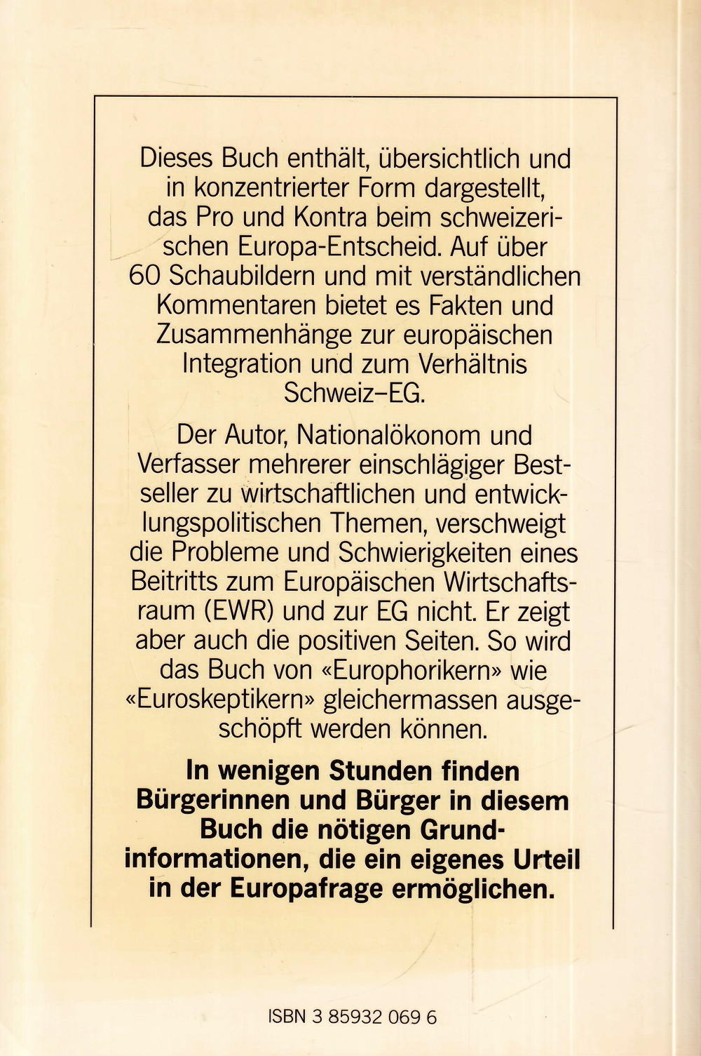 Der Autor, Nationalökonom und Verfasser mehrerer einschlägiger Bestseller zu wirtschaftlichen und entwicklungspolitischen Themen, verschweigt die Probleme und Schwierigkeiten eines Beitritts zum Europäischen Wirtschaftsraum (EWR) und zur EG nicht. Er zeigt aber auch die positiven Seiten. So wird das Buch von «Europhorikern» wie «Euroskeptikern» gleichermassen ausgeschöpft werden können.