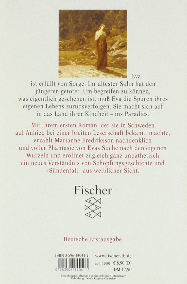 Eva ist erfüllt von Sorge: Ihr ältester Sohn hat den jüngeren getötet. Um begreifen zu können, was eigentlich geschehen ist, muss sie die Spuren ihres eigenen Lebens zurückverfolgen. Eva macht sich auf den Weg zurück in das Land ihrer Herkunft - ins Paradies. In ihrem ersten Roman, der sie in Schweden auf Anhieb bekannt machte, erzählt Marianne Fredriksson nachdenklich und voller Phantasie von Evas Suche nach dem eigenen Ursprung und eröffnet zugleich ganz unpathetisch ein neues Verständnis von Schöpfungsgeschichte und "Sündenfall" aus weiblicher Sicht. Mit diesem Roman gibt Marianne Fredriksson jeder Frau ein Stück ihrer Identität zurück.