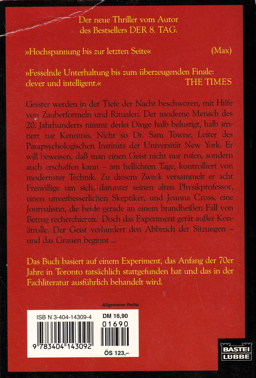 Geister werden in der Tiefe der Nacht beschworen, mit Hilfe von Zauberformeln und Ritualen. Der moderne Mensch des 20. Jahrhunderts nimmt derlei Dinge halb belustigt, halb irritiert zur Kenntnis. Nicht so Dr. Sam Towne, Leiter des Parapsychologischen Instituts der Universität New York. Er will beweisen, dass man einen Geist nicht nur rufen, sondern auch erschaffen kann - am hellichten Tage, kontrolliert von modernster Technik. Zu diesem Zweck versammelt er acht Freiwillige um sich, darunter seinen alten Physikprofessor, einen unverbesserlichen Skeptiker, und Joanna Cross, eine Journalistin, die beide gerade an einem brandheissen Fall von Betrug recherchieren. Doch das Experiment gerät ausser Kontrolle. Der Geist verhindert den Abbruch der Sitzungen und das Grauen beginnt...