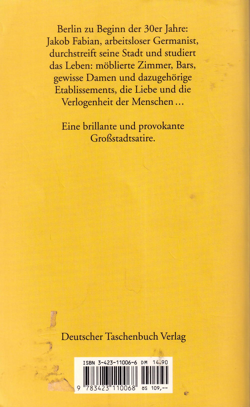 "Das Werk gilt als eine der brillantesten Satiren auf deutsche, insbesondere Berliner Zustände am Ende der zwanziger Jahre und während der grossen Wirtschaftskrise um 1930. Titelheld ist der zweiunddreissigjährige Germanist Dr. Jakob Fabian, bisher Adressenschreiber, nun Reklametexter für eine Zigarettenfirma, ein "zarter Ironiker", der "auf den Sieg der Anständigkeit wartet", nicht gerade lebenstüchtig ist und von den Menschen immer wieder übervorteilt wird." (Aus: Kindlers neues Literaturlexikon)