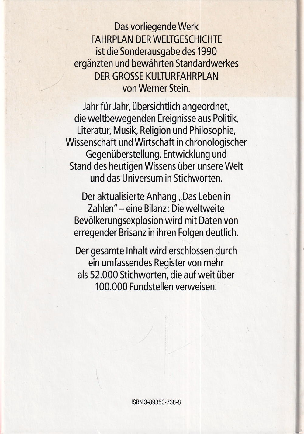 Das vorliegende Werk FAHRPLAN DER WELTGESCHICHTE ist die Sonderausgabe des 1990 ergänzten und bewährten Standardwerkes DER GROSSE KULTURFAHRPLAN von Werner Stein.