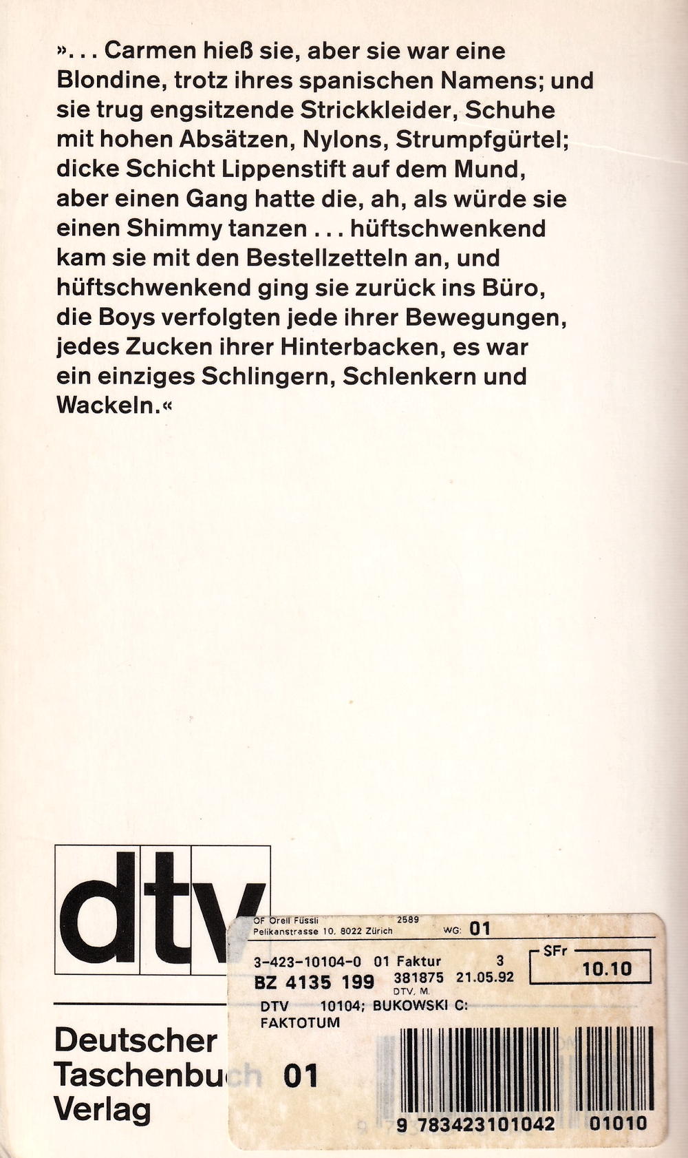 ...Carmen hiess sie, aber sie war eine Blondine, trotz ihres spanischen Namens; und sie trug engsitzende Strickkleider, Schuhe mit hohen Absätzen, Nylons, Strumpfgürtel; dicke Schicht Lippenstift auf dem Mund, aber einen Gang hatte die, ah, als würde sie einen Shimmy tanzen... Hüftschwenkend kam sie mit den Bestellzetteln an, und hüftschwenkend ging sie zurück ins Büro, die Boys verfolgten jede ihrer Bewegungen, jedes Zucken ihrer Hinterbacken, es war ein einziges Schlingern, Schlenkern und Wackeln.