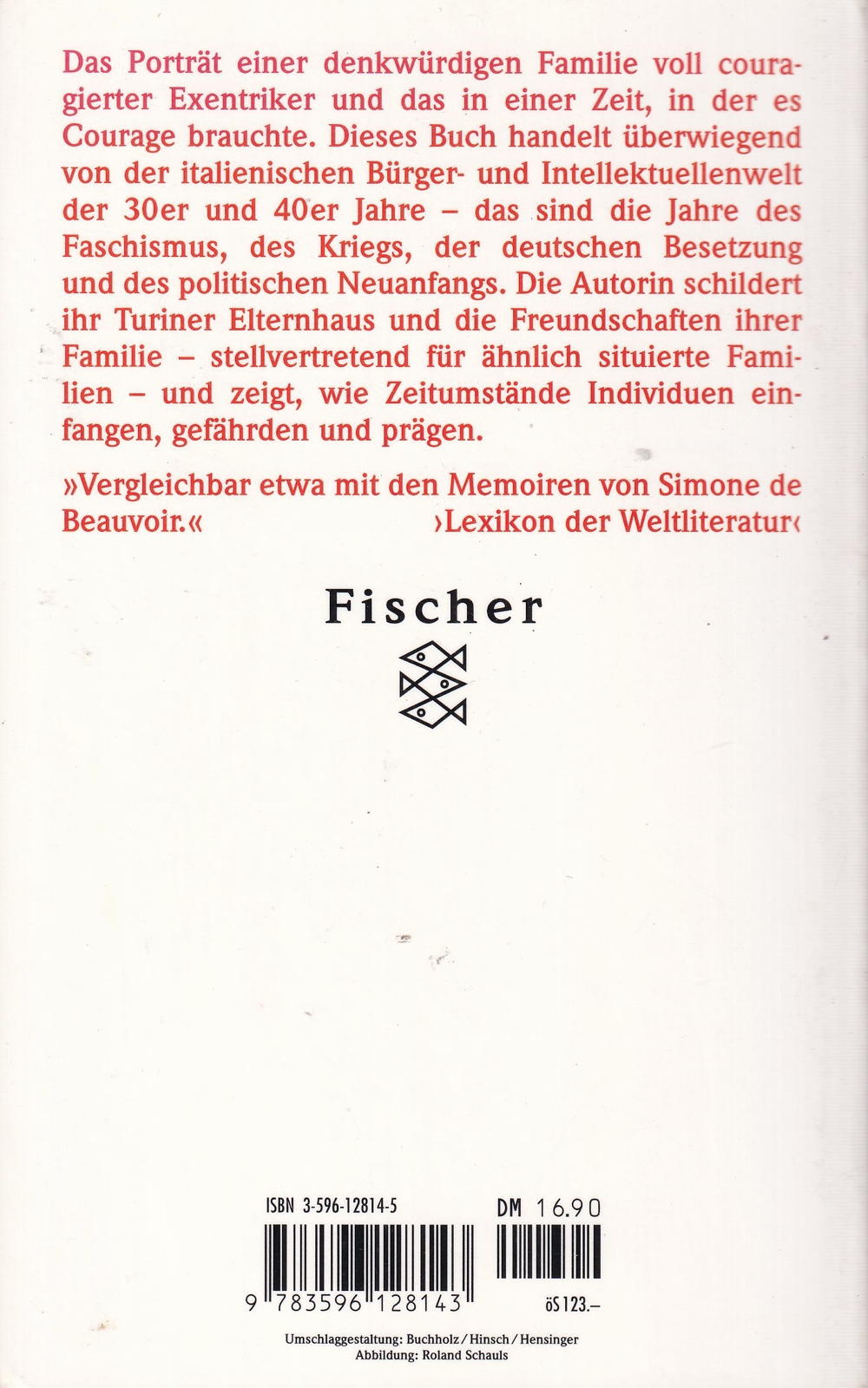 Das Porträt einer denkwürdigen Familie voll couragierter Exentriker und das in einer Zeit, in der es Courage brauchte. Dieses Buch handelt überwiegend von der italienischen Bürger- und Intellektuellenwelt der 30er und 40er Jahre - das sind die Jahre des Faschismus, des Kriegs, der deutschen Besetzung und des politischen Neuanfangs. Die Autorin schildert ihr Turiner Elternhaus und die Freundschaften ihrer Familie - stellvertretend für ähnlich situierte Familien - und zeigt, wie Zeitumstände Individuen einfangen, gefährden und prägen.