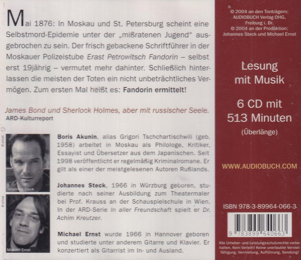 Mai 1876: In Moskau und St. Petersburg scheint eine Selbstmord-Epidemie unter der „missratenen Jugend" ausgebrochen zu sein. Der frisch gebackene Schriftführer in der Moskauer Polizeistube Erast Petrowitsch Fandorin – selbst erst 19jährig - vermutet mehr dahinter. Schliesslich hinterlassen die meisten der Toten ein nicht unbeträchtliches Vermögen. Zum ersten Mal heisst es: Fandorin ermittelt!
