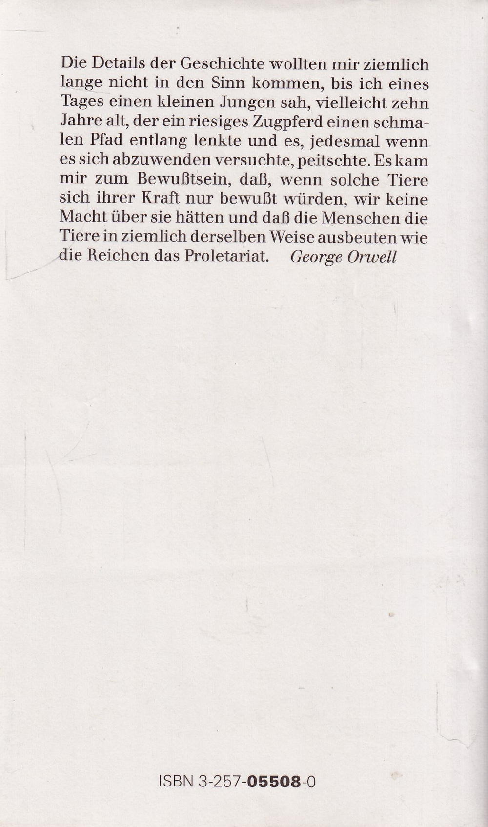 Die Details der Geschichte wollten mir ziemlich lange nicht in den Sinn kommen, bis ich eines Tages einen kleinen Jungen sah, vielleicht zehn Jahre alt, der ein riesiges Zugpferd einen schmalen Pfad entlang lenkte und es, jedesmal wenn es sich abzuwenden versuchte, peitschte. Es kam mir zum Bewusstsein, dass, wenn solche Tiere sich ihrer Kraft nur bewusst würden, wir keine Macht über sie hätten und dass die Menschen die Tiere in ziemlich derselben Weise ausbeuten wie die Reichen das Proletariat.