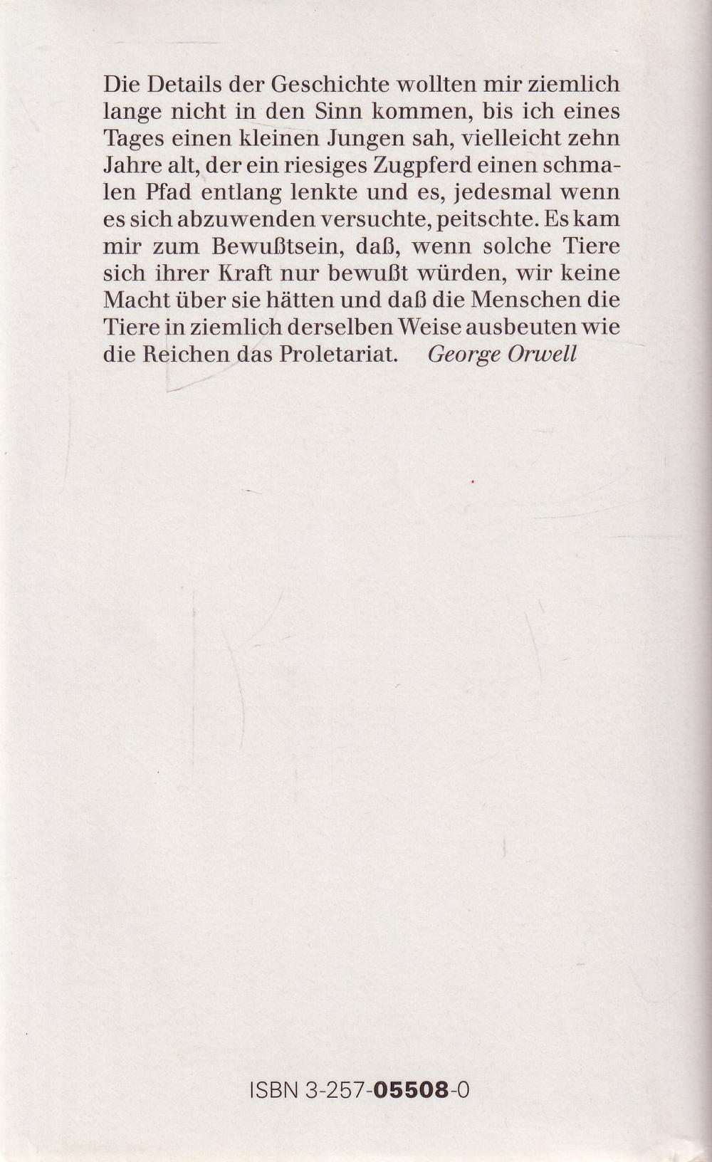 Die Details der Geschichte wollten mir ziemlich lange nicht in den Sinn kommen, bis ich eines Tages einen kleinen Jungen sah, vielleicht zehn Jahre alt, der ein riesiges Zugpferd einen schmalen Pfad entlang lenkte und es, jedesmal wenn es sich abzuwenden versuchte, peitschte. Es kam mir zum Bewusstsein, dass, wenn solche Tiere sich ihrer Kraft nur bewusst würden, wir keine Macht über sie hätten und dass die Menschen die Tiere in ziemlich derselben Weise ausbeuten wie die Reichen das Proletariat.