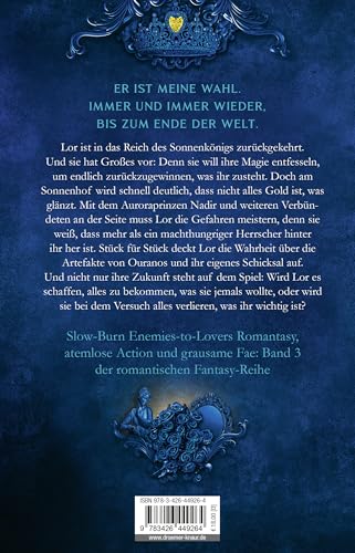 Lor ist in das Reich des Sonnenkönigs zurückgekehrt. Und sie hat Grosses vor: Mithilfe der Herzkrone will sie ihre Magie entfesseln, um endlich das Erbe ihrer Familie zurückzugewinnen. Doch am Sonnenhof wird schnell deutlich, dass nicht alles Gold ist, was glänzt. Und Aphelions High Fae und Sonnenkönig Atlas ist alles andere als erfreut, sie wiederzusehen. Mit dem Aurora-Prinzen Nadir und weiteren Verbündeten an der Seite muss Lor die Gefahren meistern, denn sie weiss, dass mehr als ein machthungriger Herrscher hinter ihrem Blut her ist. Vergangenheit und Gegenwart prallen aufeinander und Lor deckt Stück für Stück die Wahrheit über die Artefakte von Ouranos und ihr Schicksal auf. Ihre Zukunft steht auf dem Spiel und Lor ist ihrem Ziel zum Greifen nahe. Wird sie es schaffen, alles zu bekommen, was sie jemals wollte oder wird sie bei dem Versuch, alles verlieren, was ihr wichtig ist?