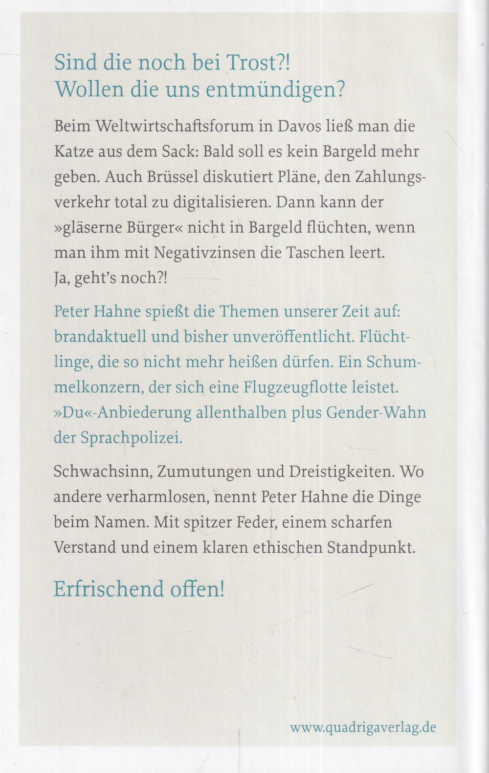 Peter Hahne, Jahrgang 1952, studierte evangelische Theologie, Philosophie und Germanistik. Stationen: Chefredaktion Politik des Saarländischen Rundfunks, seit 1985 beim ZDF als Moderator und Redakteur der Nachrichtensendungen »heute« und »heute-journal«. Von 1999 bis 2010 stellvertretender Leiter des ZDF-Hauptstadtstudios, anschliessend erhielt Peter Hahne eine nach ihm benannte sonntägliche Talkshow. Zahlreiche Buchveröffentlichungen, darunter der Bestseller »Rettet das Zigeuner-Schnitzel« (2014).