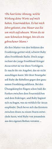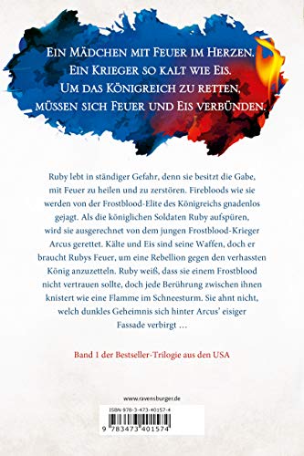 Ein Mädchen mit Feuer im Herzen. Ein Krieger so kalt wie Eis. Um das Königreich zu retten, müssen sich Feuer und Eis verbünden. Ruby lebt in ständiger Gefahr, denn sie besitzt die Gabe, mit Feuer zu heilen und zu zerstören. Firebloods wie sie werden von der Frostblood-Elite des Königreichs gnadenlos gejagt. Als die königlichen Soldaten Ruby aufspüren, wird sie ausgerechnet von dem jungen Frostblood-Krieger Arcus gerettet. Kälte und Eis sind seine Waffen, doch er braucht Rubys Feuer, um eine Rebellion gegen den verhassten König anzuzetteln. Ruby weiss, dass sie einem Frostblood nicht vertrauen sollte, doch jede Berührung zwischen ihnen knistert wie eine Flamme im Schneesturm. Sie ahnt nicht, welch dunkles Geheimnis sich hinter Arcus‘ eisiger Fassade verbirgt …