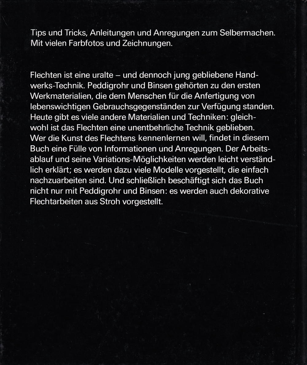 Wer die Kunst des Flechtens kennenlernen will, findet in diesem Buch eine Fülle von Informationen und Anregungen. Der Arbeitsablauf und seine Variations-Möglichkeiten werden leicht verständlich erklärt; es werden dazu viele Modelle vorgestellt, die einfach nachzuarbeiten sind. Und schliesslich beschäftigt sich das Buch nicht nur mit Peddigrohr und Binsen: es werden auch dekorative Flechtarbeiten aus Stroh vorgestellt.