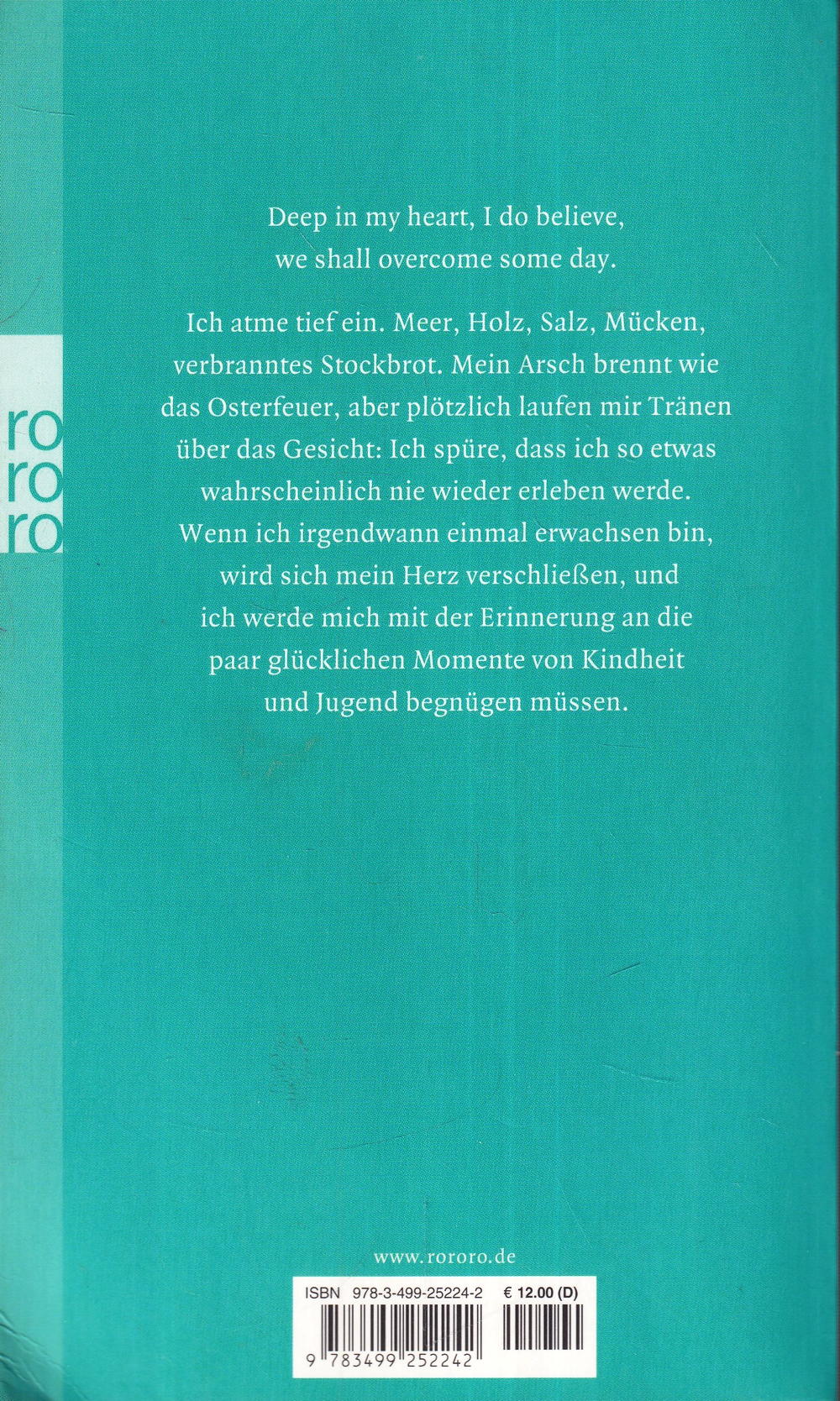 Deep in my heart, I do believe, we shall overcome some day. Ich atme tief ein. Meer, Holz, Salz, Mücken, verbranntes Stockbrot. Mein Arsch brennt wie das Osterfeuer, aber plötzlich laufen mir Tränen über das Gesicht: Ich spüre, dass ich so etwas wahrscheinlich nie wieder erleben werde. Wenn ich irgendwann einmal erwachsen bin, wird sich mein Herz verschliessen und ich werde mich mit der Erinnerung an die paar glücklichen Momente von Kindheit und Jugend begnügen müssen. Ich weiss, dass ich Recht habe.