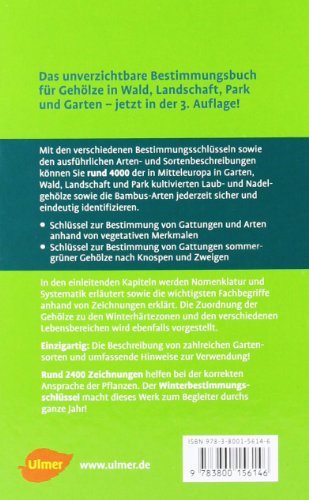 Gehölzbestimmung einfach und sicher im belaubten und unbelaubten Zustand In den einleitenden Kapiteln werden Nomenklatur und Systematik erläutert sowie die wichtigsten Fachbegriffe anhand von Zeichnungen erklärt. Die Zuordnung der Gehölze zu den Winterhärtezonen und den verschiedenen Lebensbereichen wird ebenfalls vorgestellt. Mit den verschiedenen Bestimmungsschlüsseln sowie den ausführlichen Arten- und Sortenbeschreibungen können Sie rund 4000 Laub- und Nadelgehölze Mitteleuropas sowie die Bambus-Arten in Garten, Wald und Park jederzeit sicher und eindeutig identifizieren: - Schlüssel zur Bestimmung von Gattungen und Arten anhand von vegetativen Merkmalen - Schlüssel zur Bestimmung von Gattungen sommergrüner Gehölze nach Knospen und Zweigen Einzigartig: Die Beschreibung von zahlreichen Gartensorten! Über 2500 Zeichnungen helfen bei der korrekten Ansprache der Pflanzen. Der neu erstellte Knospenbestimmungsschlüssel macht dieses Werk zum Begleiter durchs ganze Jahr! - bewährtes Bestimmungsbuch - mit Knospenbestimmungsschlüssel - über 2500 Zeichnungen - rund 4000 Arten, Sorten, Varietäten und Subspezies