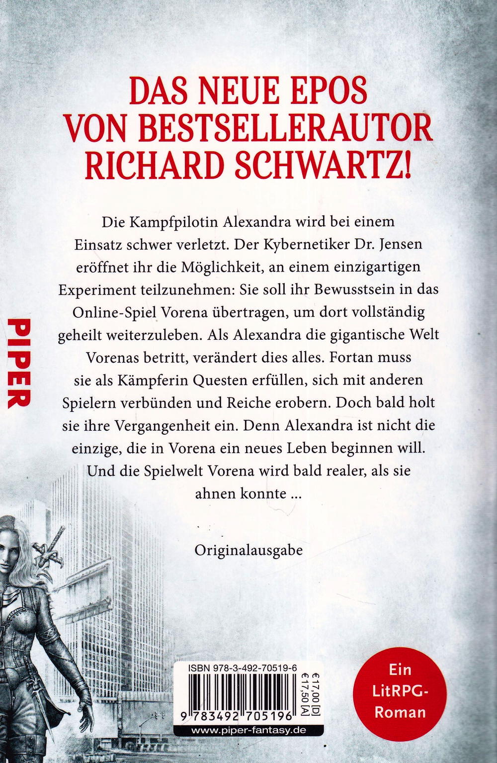Alexandra McInnes hat als Pilotin der Special Forces zahlreiche Einsätze erfolgreich geflogen. Doch bei einem verheerenden Unfall wird sie schwer verletzt. Der Kybernetiker Dr. Jensen eröffnet ihr die Möglichkeit, an einem einzigartigen Experiment teilzunehmen: Sie soll ihr Bewusstsein in das Online-Spiel Vorena übertragen und dort vollständig geheilt weiterleben. Als Alexandra die gigantische Welt Vorenas betritt, verändert dies alles. Fortan muss sie als Kämpferin Questen erfüllen, sich mit anderen Spielern verbünden und Reiche erobern. Doch bald holt sie ihre Vergangenheit ein. Denn Alexandra ist nicht die einzige, die in Vorena ein neues Leben beginnen will. Und die Spielwelt Vorena wird bald realer, als sie ahnen konnte ... Der grosse LitRPG-Roman von Richard Schwartz!