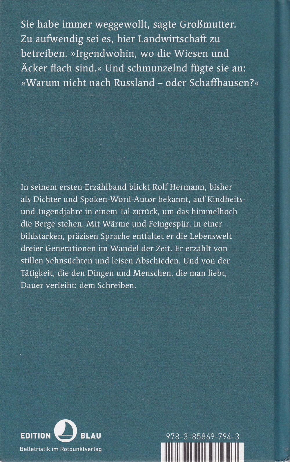 Mit seinem ersten Erzählband betritt Rolf Hermann literarisches Neuland. Er blickt auf Kindheits- und Jugendjahre in einem Tal zurück, um das himmelhoch die Berge stehen. Mit Wärme und Feingespür, in einer bildstarken, präzisen Sprache entfaltet er die Lebenswelt dreier Generationen im Wandel der Zeit. Er erzählt - eine sanfte Melancholie, bisweilen auch einen stechenden Schmerz auslösend - von stillen Sehnsüchten und leisen Abschieden. Und von der Tätigkeit, die den Dingen und Menschen, die man liebt, Dauer verleiht: dem Schreiben.