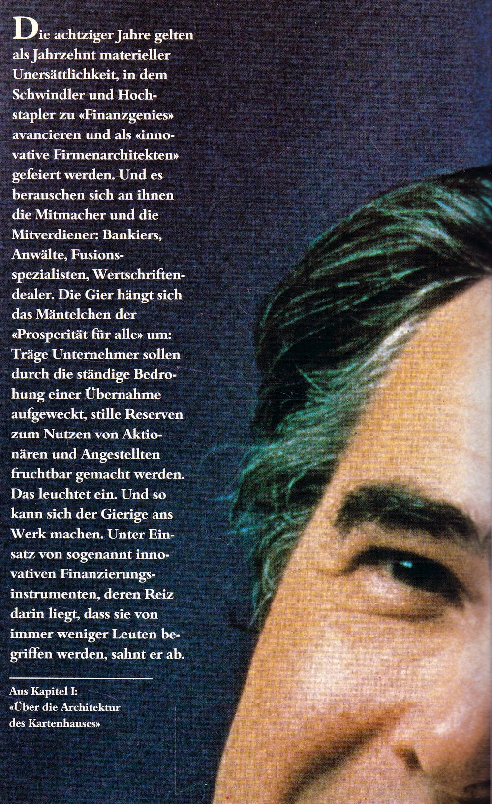 Die achtziger Jahre gelten als Jahrzehnt materieller Unersättlichkeit, in dem Schwindler und Hochstapler zu «Finanzgenies» avancieren und als «innovative Firmenarchitekten» gefeiert werden. Und es berauschen sich an ihnen die Mitmacher und die Mitverdiener: Bankiers, Anwälte, Fusionsspezialisten, Wertschriftendealer. Die Gier hängt sich das Mäntelchen der «Prosperität für alle» um: Träge Unternehmer sollen durch die ständige Bedrohung einer Übernahme aufgeweckt, stille Reserven zum Nutzen von Aktionären und Angestellten fruchtbar gemacht werden.