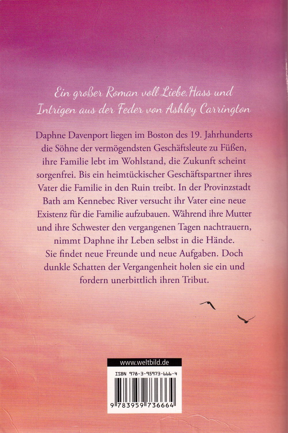 Ein grosser Roman voll Liebe, Hass und Intrigen aus der Feder von Ashley Carrington Daphne Davenport liegen im Boston des 19. Jahrhunderts die Söhne der vermögendsten Geschäftsleute zu Füssen, ihre Familie lebt im Wohlstand, die Zukunft scheint sorgenfrei. Bis ein heimtückischer Geschäftspartner ihres Vater die Familie in den Ruin treibt. In der Provinzstadt Bath am Kennebec River versucht ihr Vater eine neue Existenz für die Familie aufzubauen. Während ihre Mutter und ihre Schwester den vergangenen Tagen nachtrauern, nimmt Daphne ihr Leben selbst in die Hände. Sie findet neue Freunde und neue Aufgaben. Doch dunkle Schatten der Vergangenheit holen sie ein und fordern unerbittlich ihren Tribut.
