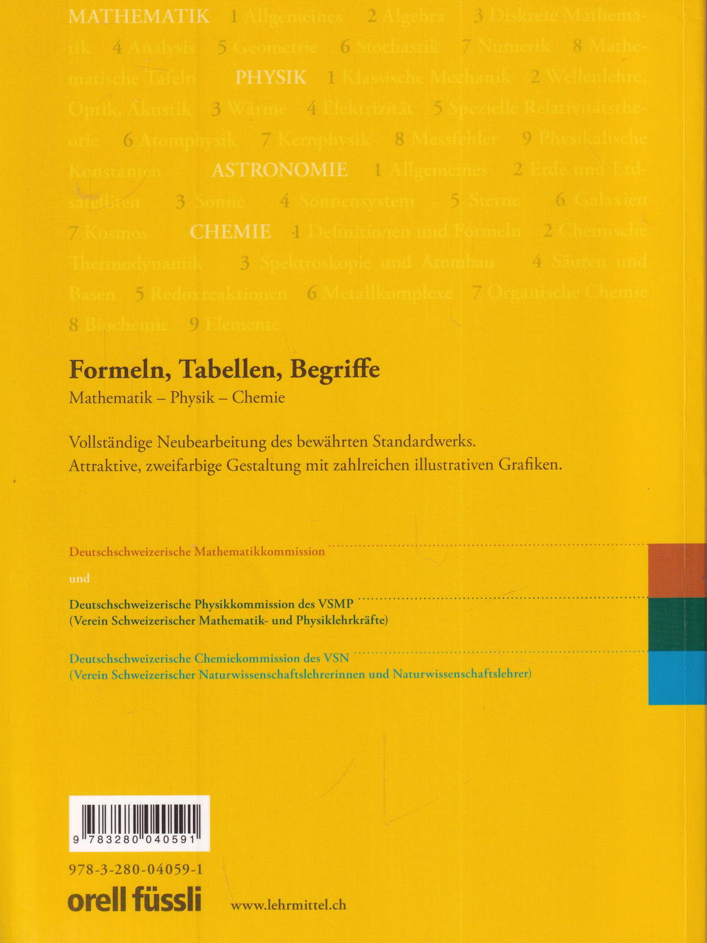 Das bewährte Schweizer Nachschlagewerk ist fundiert aufgearbeitet und stetig weiter verbessert worden. Eine vielfältige Auswahl an Wissensinhalte ermöglicht einen Einsatz in der Sekundarstufe II, wie aber in der tertiären Ausbildung. Die zweifarbige Gestaltung, die zahlreichen illustrativen Grafiken und das umfangreiche Stichwortverzeichnis machen das Werk zu einem praktischen Arbeitsinstrument und -begleiter. 'Formeln, Tabellen, Begriffe' wurde von Mitgliedern der Deutschschweizerischen Mathematikkommission (DMK), der Deutschschweizerischen Physikkommission (DPK) des VSMP und der Deutschschweizerischen Chemiekommission des VSN erarbeitet.