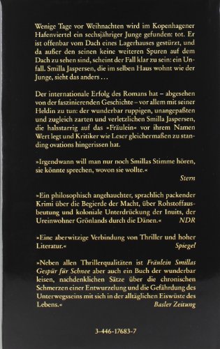 tot. Er ist offenbar vom Dach eines Lagerhauses gestürzt, und da ausser den seinen keine weiteren Spuren auf dem Dach zu sehen sind, scheint der Fall klar zu sein: ein Unfall. Smilla Jaspersen, die im selben Haus wohnt wie der Junge, sieht das anders...