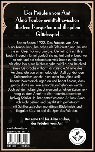 Baden-Baden 1922. Das Fräulein vom Amt Alma Täuber liebt ihre Arbeit als Telefonistin und meistert sie mit Geschick und Energie. Gemeinsam mit ihrer besten Freundin Emmi geniesst sie es, frei und unbeschwert zu sein und ein selbstbestimmtes Leben zu führen. Als Alma bei einer Telefonschalte zufällig den Bruchteil eines Gesprächs mithört, lässt sie die Stimme des Anrufers, die von einem erledigten Auftrag »bei den Kolonnaden« spricht, nicht mehr los. Alma stellt beherzt Nachforschungen an und findet heraus, dass genau dort eine Frau ermordet aufgefunden wurde. Doch bei der Polizei glaubt niemand an einen Zusammenhang zu dem Anruf – ausser Kommissaranwärter Ludwig Schiller.