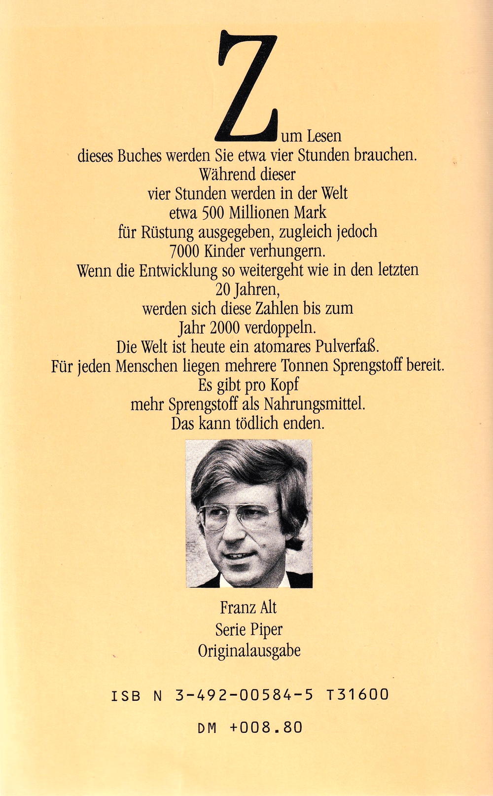 Zum Lesen dieses Buches werden Sie etwa vier Stunden brauchen. Während dieser vier Stunden werden in der Welt etwa 500 Millionen Mark für Rüstung ausgegeben, zugleich jedoch 7000 Kinder verhungern. Wenn die Entwicklung so weitergeht wie in den letzten 20 Jahren, werden sich diese Zahlen bis zum Jahr 2000 verdoppeln. Die Welt ist heute ein atomares Pulverfaß. Für jeden Menschen liegen mehrere Tonnen Sprengstoff bereit. Es gibt pro Kopf mehr Sprengstoff als Nahrungsmittel. Das kann tödlich enden.