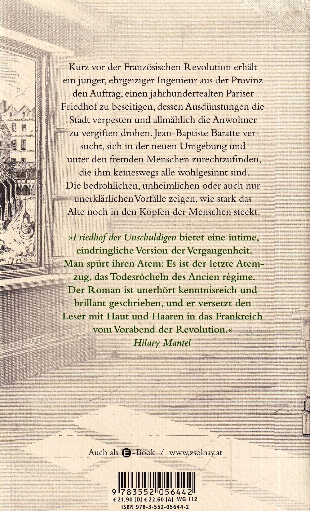 Frankreich, Ende des 18. Jahrhunderts: Im Schloss von Versailles wird dem jungen Ingenieur Jean-Baptiste Baratte von höchster Stelle ein Auftrag erteilt. Er soll den Friedhof der Unschuldigen demolieren, der, mitten in Paris gelegen, Hunderttausende von Toten beherbergt und dessen Ausdünstungen die Stadt langsam vergiften, so dass der Wein in den Kellern zu Essig wird, Fleisch binnen Minuten verfault. Aber es soll möglichst unauffällig geschehen, der Pöbel ist abergläubisch und will die Totenruhe nicht gestört sehen. Miller erzählt diese Geschichte vom Vorabend der Revolution und den widerstreitenden Kräften des Alten und des Neuen in einer kühnen, eleganten Prosa.
