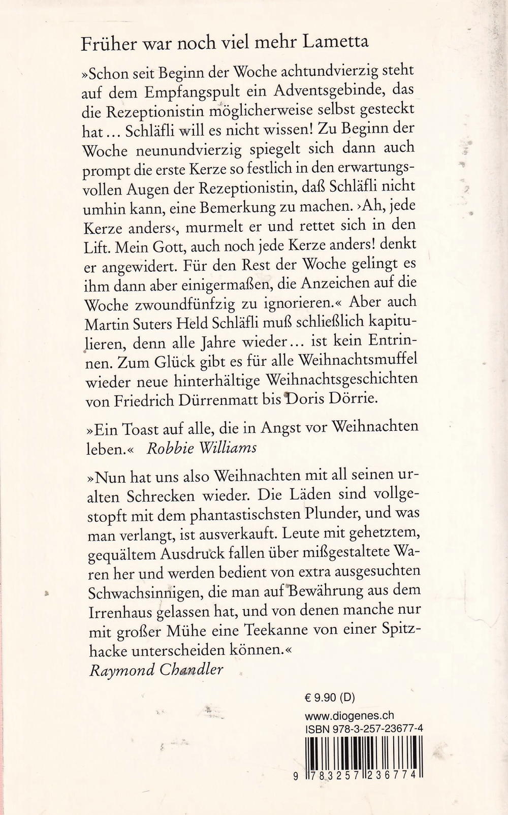 "Schon seit Beginn der Woche achtundvierzig steht auf dem Empfangspult ein Adventsgebinde, das die Rezeptionistin möglicherweise selbst gesteckt hat... Schläfli will es nicht wissen! Zu Beginn der Woche neunundvierzig spiegelt sich dann auch prompt die erste Kerze so festlich in den erwartungsvollen Augen der Rezeptionistin, dass Schläfli nicht umhin kann, eine Bemerkung zu machen. "Ah, jede Kerze anders", murmelt er und rettet sich in den Lift. Mein Gott, auch noch jede Kerze anders!, denkt er angewidert. Für den Rest der Woche gelingt es ihm dann aber einigermassen, die Anzeichen auf die Woche zwoundfünfzig zu ignorieren." Aber auch Martin Suters Held Schläfli muss schliesslich kapitulieren, denn alle Jahre wieder... ist kein Entrinnen. Zum Glück gibt es für alle Weihnachtsmuffel wieder neue hinterhältige Weihnachtsgeschichten von Friedrich Dürrenmatt bis Doris Dörrie.