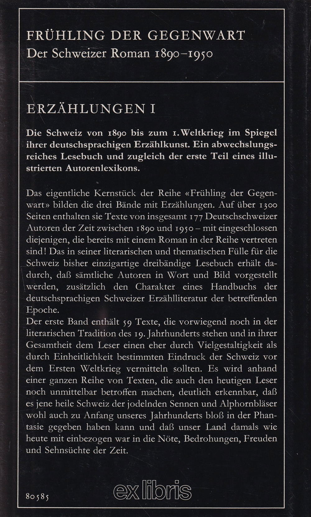 Das eigentliche Kernstück der Reihe «Frühling der Gegenwart» bilden die drei Bände mit Erzählungen. Auf über 1300 Seiten enthalten sie Texte von insgesamt 177 Deutschschweizer Autoren der Zeit zwischen 1890 und 1950- mit eingeschlossen diejenigen, die bereits mit einem Roman in der Reihe vertreten sind! Das in seiner literarischen und thematischen Fülle für die Schweiz bisher einzigartige dreibändige Lesebuch erhält dadurch, dass sämtliche Autoren in Wort und Bild vorgestellt werden, zusätzlich den Charakter eines Handbuchs der deutschsprachigen Schweizer Erzählliteratur der betreffenden Epoche.