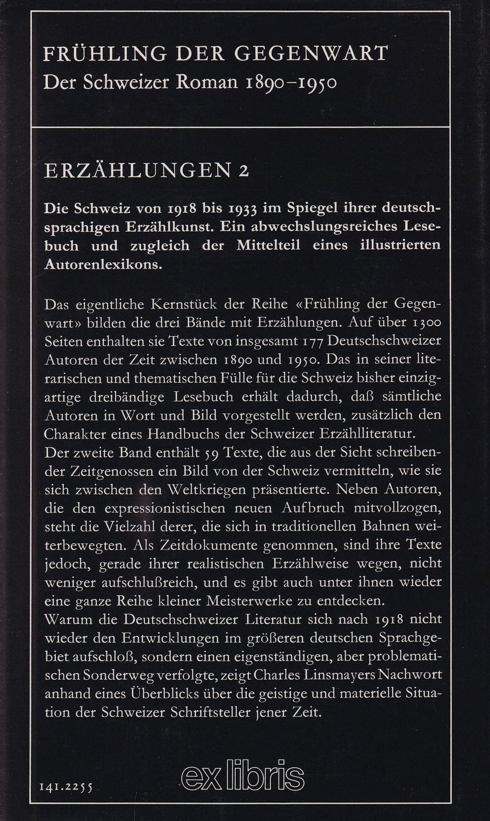 Der zweite Band enthält 59 Texte, die aus der Sicht schreibender Zeitgenossen ein Bild von der Schweiz vermitteln, wie sie sich zwischen den Weltkriegen präsentierte. Neben Autoren, die den expressionistischen neuen Aufbruch mitvollzogen, steht die Vielzahl derer, die sich in traditionellen Bahnen weiterbewegten. Als Zeitdokumente genommen, sind ihre Texte jedoch, gerade ihrer realistischen Erzählweise wegen, nicht weniger aufschlussreich, und es gibt auch unter ihnen wieder eine ganze Reihe kleiner Meisterwerke zu entdecken.