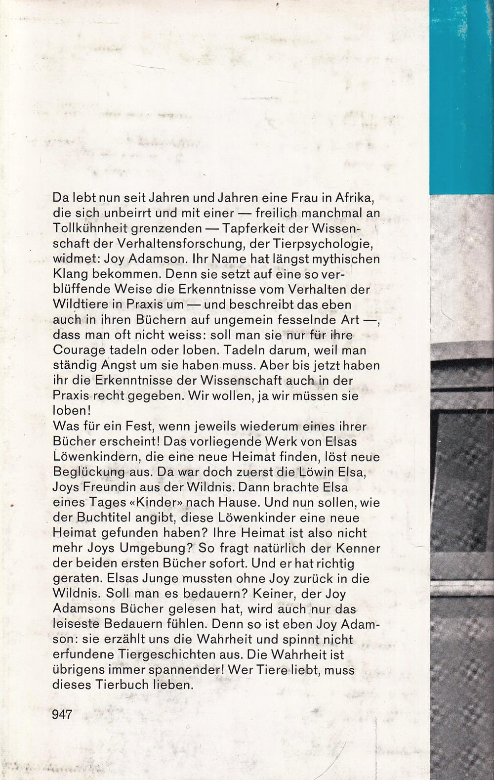 Was für ein Fest, wenn jeweils wiederum eines ihrer Bücher erscheint! Das vorliegende Werk von Elsas Löwenkindern, die eine neue Heimat finden, löst neue Beglückung aus. Da war doch zuerst die Löwin Elsa, Joys Freundin aus der Wildnis. Dann brachte Elsa eines Tages «Kinder» nach Hause. Und nun sollen, wie der Buchtitel angibt, diese Löwenkinder eine neue Heimat gefunden haben? Ihre Heimat ist also nicht mehr Joys Umgebung? So fragt natürlich der Kenner der beiden ersten Bücher sofort. Und er hat richtig geraten. Elsas Junge mussten ohne Joy zurück in die Wildnis. Soll man es bedauern? Keiner, der Joy Adamsons Bücher gelesen hat, wird auch nur das leiseste Bedauern fühlen. Denn so ist eben Joy Adamson: sie erzählt uns die Wahrheit und spinnt nicht erfundene Tiergeschichten aus. Die Wahrheit ist übrigens immer spannender! Wer Tiere liebt, muss dieses Tierbuch lieben.