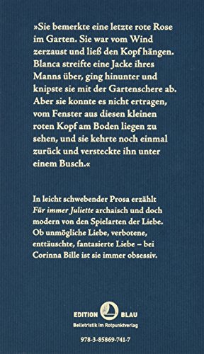 Die acht Erzählungen erzählen von der Liebe, von der Liebe einer Frau. Juliette, Helena, Fräulein von M. oder Cecilia, alle werden durch die Liebe erschüttert. Fräulein von M. , eigentlich verlobt mit dem Baron, hat in der Silvesternacht ihr erste sexuelle Berührung mit einem fremden jungen Mann, und ihre Ruh ist hin. Eine Betreuerin in einem Ferienheim verliebt sich in den 13-jährigen Laurent und verliert darüber fast den Verstand. Für eine Frau, die beobachtet, wie ihre Tochter zum ersten Mal begehrt wird, bricht eine Welt zusammen. Ob es um die unmögliche Liebe geht, um die verbotene, die enttäuschte, die fantasierte Liebe bei Corinna Bille ist sie immer exzessiv. Die Dramatik wird von einer starken Atmosphäre getragen: Der Geruch von Unterholz, das Gras, der Sand, der Fluss, der Schnee, die Nacht wühlen auf und besänftigen. Corinna Bille zeigt sich in *Für immer Juliette* auf dem Höhepunkt ihres Schaffens. Ganz konkret erzählend gelingt ihr doch etwas Schwebendes, bewahrt sie ein Geheimnis. Und mit ihren verwegenen Darstellungen von Erotik zeigt sie sich ihrer Zeit weit voraus.