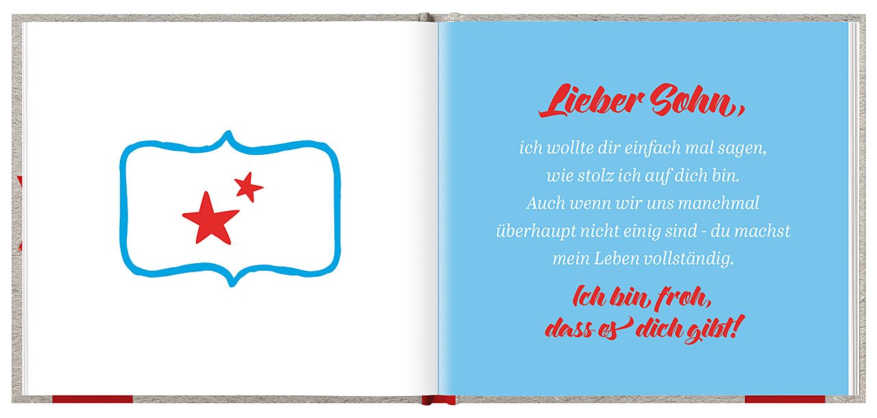 Dieses Büchlein ist das perfekte Mitbringsel für alle, die Ihrem Sohn auf witzige Weise zeigen wollen, wie lieb sie ihn haben. Das Büchlein ist ohne Bilder rein typografisch gestaltet. Kurze Texte wurden z.B. mit unterschiedlichen Schriftarten, Farben und Ornamenten spielerisch umgesetzt und abwechslungsreich gestaltet.