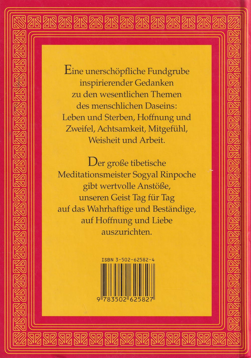 Der grosse tibetische Meditationsmeister Sogyal Rinpoche gibt wertvolle Anstösse, unseren Geist Tag für Tag auf das Wahrhaftige und Beständige, auf Hoffnung und Liebe auszurichten.