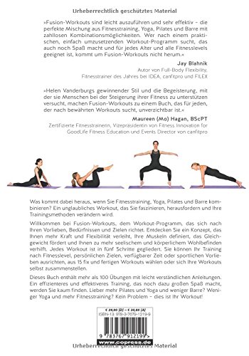 Was kommt dabei heraus, wenn Sie Fitnesstraining, Yoga, Pilates und Barre kombinieren? Ein unglaubliches Workout, das Sie faszinieren, herausfordern und Ihre Trainingsmethoden verändern wird. Willkommen bei Fusion-Workouts, dem Workout-Programm, das sich nach Ihren Vorlieben, Bedürfnissen und Zielen richtet. Entdecken Sie ein Konzept, das Ihnen mehr Kraft und Flexibilität verleiht, Ihre Muskeln definiert, das Gleichgewicht fördert und Ihnen zu mehr seelischem und körperlichem Wohlbefinden verhilft. Jedes Workout ist in fünf Schritte gegliedert. Sie können Ihr Training nach Fitnesslevel, persönlichen Zielen, verfügbarer Zeit oder sportlichen Vorlieben ausrichten, aus 15 fix und fertigen Workouts wählen oder sich Ihre Workouts selbst zusammenstellen. Dieses Buch enthält mehr als 100 Übungen mit leicht verständlichen Anleitungen. Ein effizienteres und effektiveres Training, das noch dazu grossen Spass macht, werden Sie kaum finden.