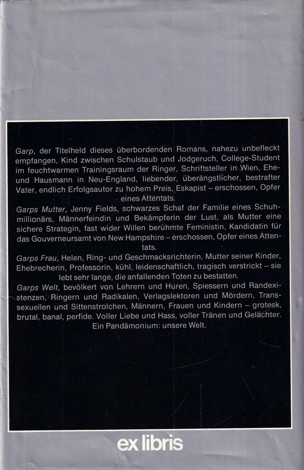 Garp, der Titelheld dieses überbordenden Romans, nahezu unbefleckt empfangen, Kind zwischen Schulstaub und Jodgeruch, College-Student im feuchtwarmen Trainingsraum der Ringer, Schriftsteller in Wien, Eheund Hausmann in Neu-England, liebender, überängstlicher, bestrafter Vater, endlich Erfolgsautor zu hohem Preis, Eskapist – erschossen, Opfer eines Attentats.