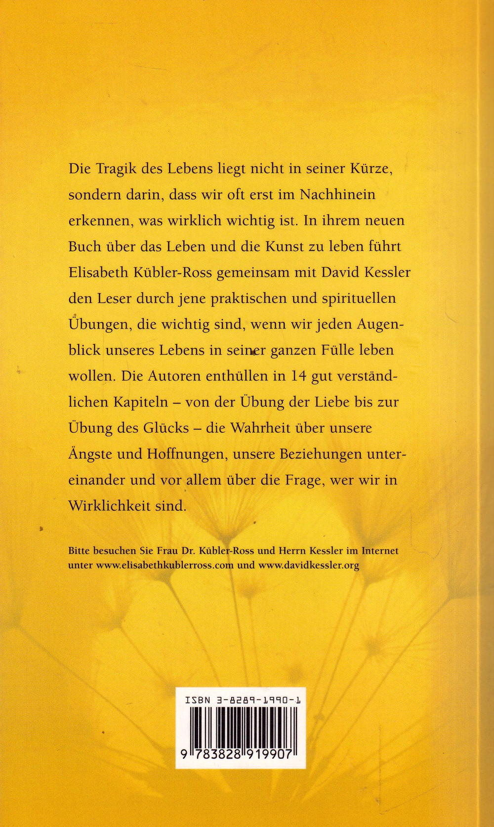 Die Tragik des Lebens liegt nicht in seiner Kürze, sondern darin, dass wir oft erst im Nachhinein erkennen, was wirklich wichtig ist. In ihrem neuen Buch über das Leben und die Kunst zu leben führt Elisabeth Kübler-Ross gemeinsam mit David Kessler den Leser durch jene praktischen und spirituellen Übungen, die wichtig sind, wenn wir jeden Augenblick unseres Lebens in seiner ganzen Fülle leben wollen. Die Autoren enthüllen in 14 gut verständlichen Kapiteln – von der Übung der Liebe bis zur Übung des Glücks – die Wahrheit über unsere Ångste und Hoffnungen, unsere Beziehungen untereinander und vor allem über die Frage, wer wir in Wirklichkeit sind.