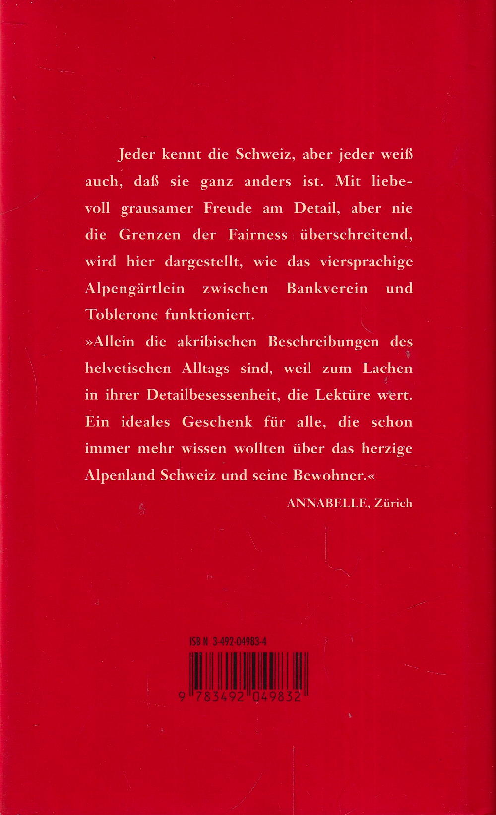 Jeder kennt die Schweiz, aber jeder weiss auch, dass sie ganz anders ist. Mit liebevoll grausamer Freude am Detail, aber nie die Grenzen der Fairness überschreitend, wird hier dargestellt, wie das viersprachige Alpengärtlein zwischen Bankverein und Toblerone funktioniert.