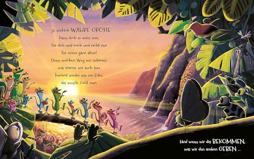 Eine humorvolle und liebevoll gereimte Vorlesegeschichte über ein kleines Tier, das gerne ein grosser Star wäre. Für alle Fans von Der Löwe in dir. In einem fernen Inselparadies hat ein kleiner Gecko namens Goldi grosse Pläne. Er hält sich für etwas ganz Besonderes und bestimmt wird er einmal ein richtiger Star! Von früh bis spät und ohne Rücksicht auf andere, drängt Goldi sich gern in den Vordergrund. Bis er plötzlich allein dasteht und erkennt, dass sich nicht immer alles nur um ihn dreht. Vielleicht gibt es noch einen anderen Weg zum Glücklichsein?