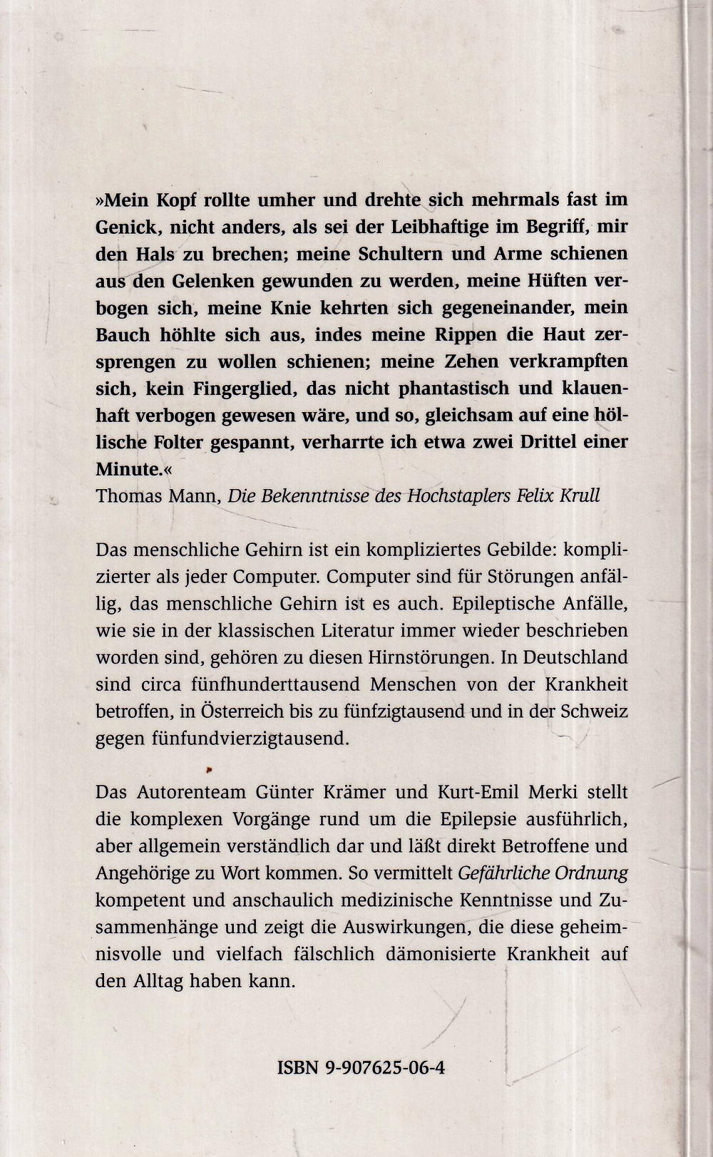 Das Autorenteam Günter Krämer und Kurt-Emil Merki stellt die komplexen Vorgänge rund um die Epilepsie ausführlich, aber allgemein verständlich dar und lässt direkt Betroffene und Angehörige zu Wort kommen. So vermittelt Gefährliche Ordnung kompetent und anschaulich medizinische Kenntnisse und Zusammenhänge und zeigt die Auswirkungen, die diese geheimnisvolle und vielfach fälschlich dämonisierte Krankheit auf den Alltag haben kann.