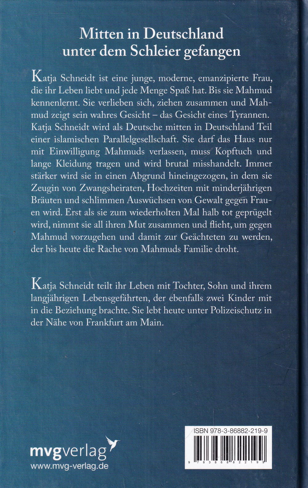 Katja Schneidt ist eine lebensfrohe, selbstbewusste junge Frau. Bis sie Mahmud kennenlernt. Die beiden verlieben sich und ziehen zusammen. Dann zeigt Mahmud sein wahres Gesicht - das Gesicht eines Tyrannen. Katja Schneidt wird als Deutsche mitten in Deutschland Teil einer islamischen Parallelgesellschaft. Sie darf nicht mehr ohne Erlaubnis das Haus verlassen, muss Kopftuch tragen, wird brutal misshandelt und zur unfreiwilligen Zeugin von Zwangshochzeiten. Erst als die Gewalt überhandnimmt, sammelt sie all ihren Mut und flieht, um Mahmud anzuzeigen. Sie wird damit zur Geächteten, der bis heute die Blutrache von Mahmuds Familie droht.